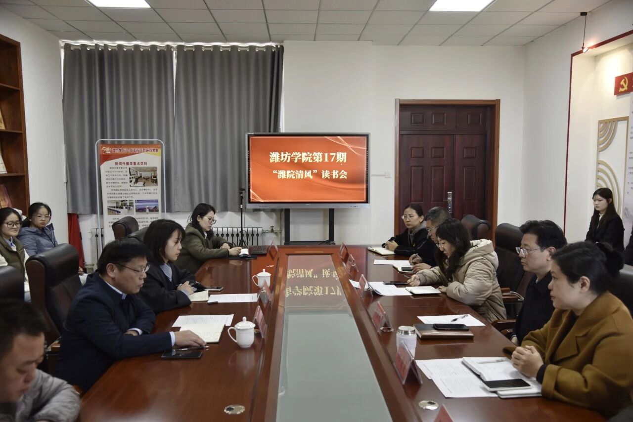 为筑牢师生廉洁思想防线、厚植校园清廉文化根基,11月19日,传媒学院举办第17期“潍院清风”读书会活动。学校纪检监察机关有关负责同志参加读书会。传媒学院党委主要负责人主持,传媒学院领导班子成员、全体辅导员、教师代表及学生代表参加本次活动。
